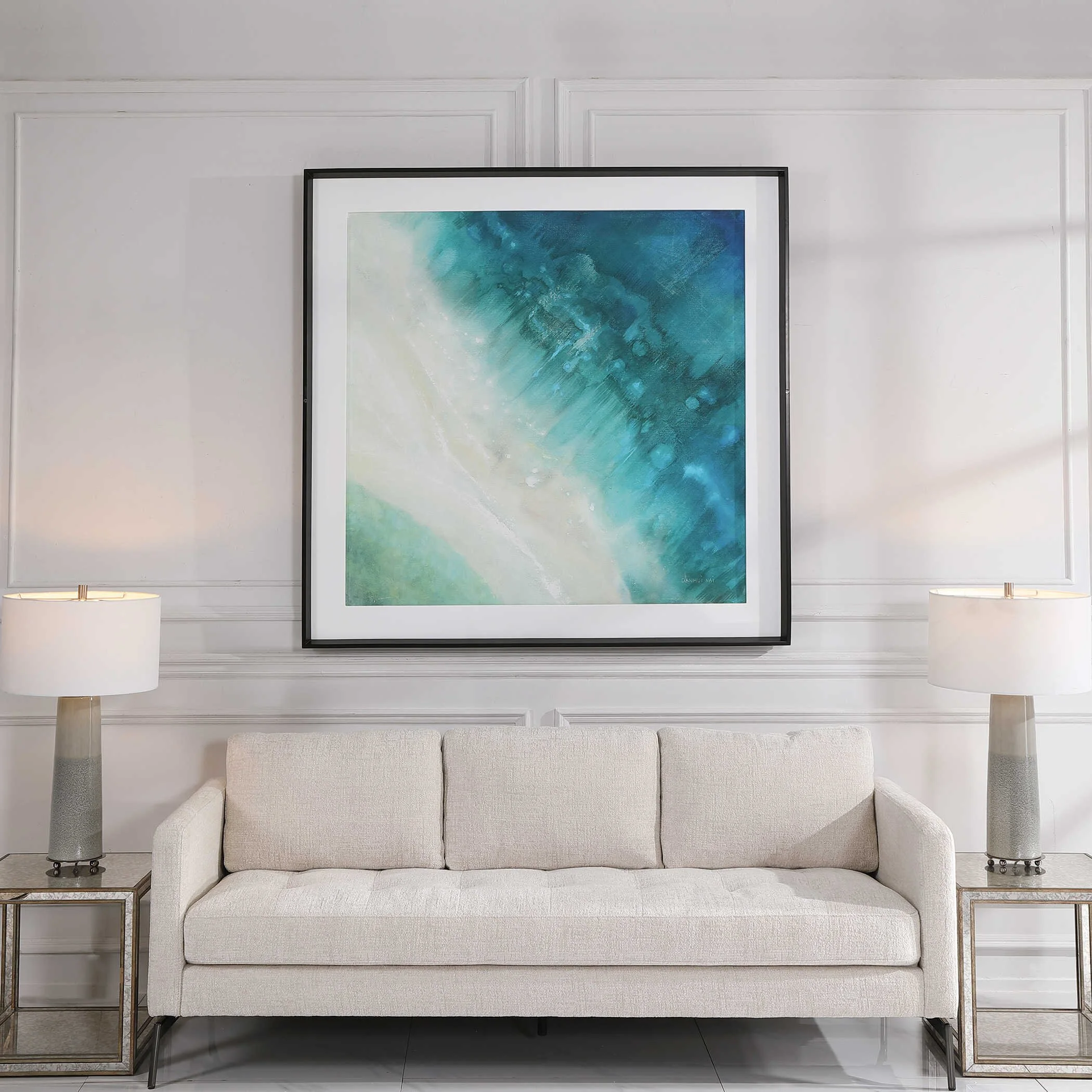 Select the wall space first, measure it out so you know what you are working with, having this information will help in the long run and allow you to enjoy selecting the artwork you want for your space. A general rule of thumb for working with a sofa wall is the piece selected should be at least ⅔ of the sofa or larger. Also remember, a small piece of art will not fill a large space no matter how much you love it. (Hint: if you are in love with a small piece of artwork think about having it matted and framed in a larger size to accommodate the space you would like it to fill.)